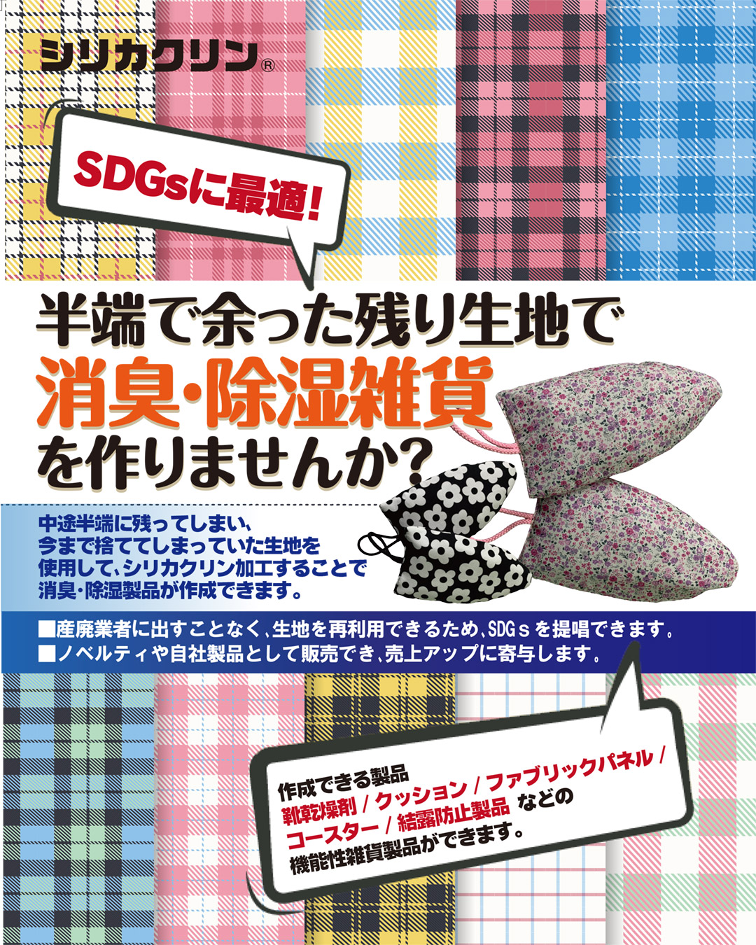 中途半端に残ってしまい、今まで捨ててしまっていた生地を使用して、シリカクリン加工することで消臭・除湿製品が作成できます。 ■産廃業者に出すことなく、生地を再利用できるため、SDGsを提唱できます。 ■ノベルティや自社製品として販売でき、売上アップに寄与します。 作成できる製品 靴乾燥剤/クッション/ファブリックパネル/ コースター/結露防止製品などの 機能性雑貨製品ができます。