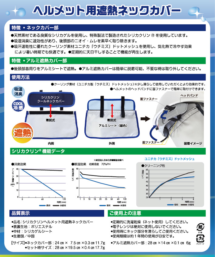 後頭部の遮熱に!冷却・消臭ネックカバー付! ●天然素材である良質なシリカゲルを使用し、特殊な製法で製造されたシリカクリン®を使用しています。 消臭・吸湿に速効性があり、あごのニオイ・ムレを素早く取り除きます。 ●吸汗速乾性に優れたクーリング素材ユニチカ製「ウチミズ」ドットメッシュを使用し、気化熱で冷やす効果によって暑い時期にも最適です。 ●定期的に天日干しすることで機能が再生するECO製品です。